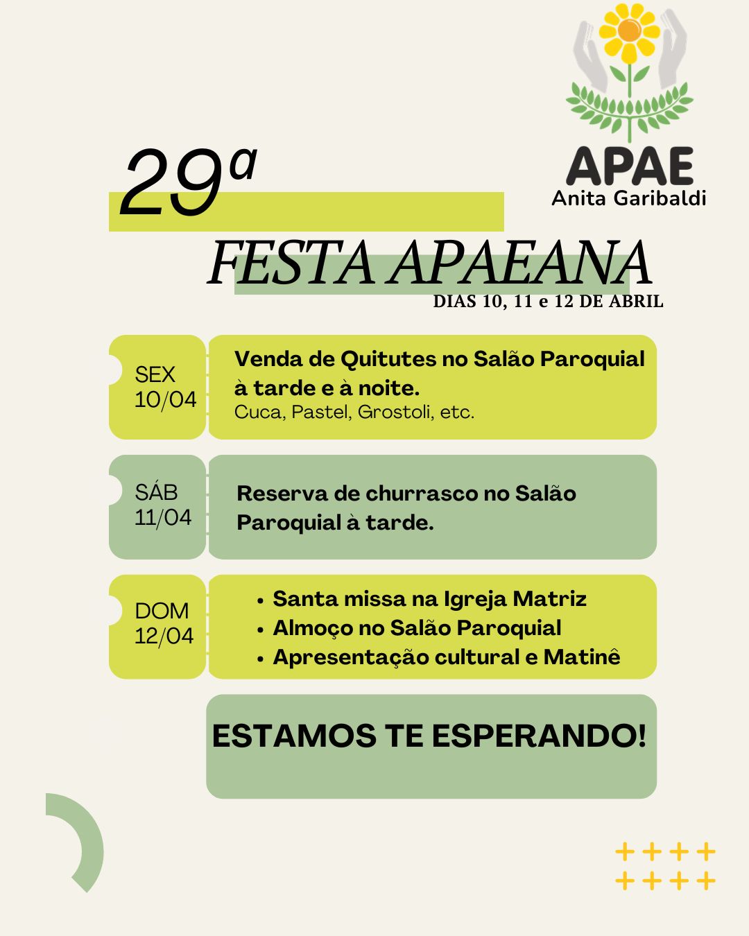 A APAE Anita Garibaldi promove, entre os dias 10 e 12 de abril, a 29ª edição da tradicional Festa Apaeana. O evento reúne a comunidade em três dias de programação com atividades religiosas, culturais e gastronômicas no município.