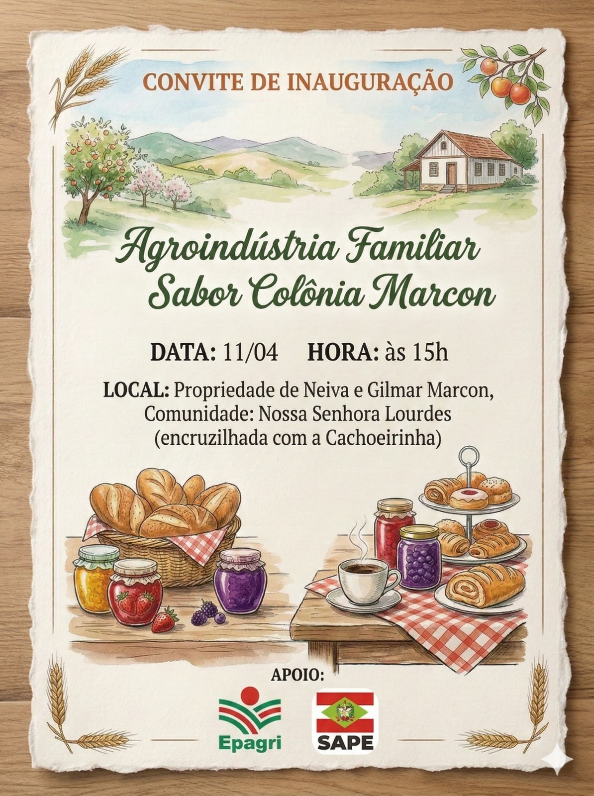 O evento está marcado para as 15h e será realizado na propriedade de Neiva e Gilmar Marcon, localizada na encruzilhada com a localidade da Cachoeirinha. A iniciativa busca valorizar a produção artesanal e fortalecer a agricultura familiar na região.