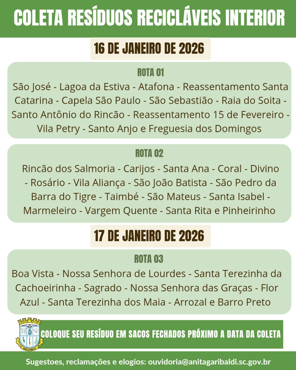 Os moradores são orientados a colocar os resíduos recicláveis em sacos fechados e podem entrar em contato com a ouvidoria para sugestões, reclamações ou elogios através do e-mail: ouvitoria@anitagaribaldi.sc.gov.br.