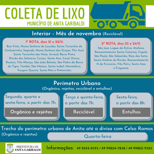 Devido ao feriado do Dia da Proclamação da República, em 15/11, a coleta de lixo no interior do município de Anita Garibaldi foi transferida neste mês de novembro para a quarta semana, entre as datas de 21 e 24/11.