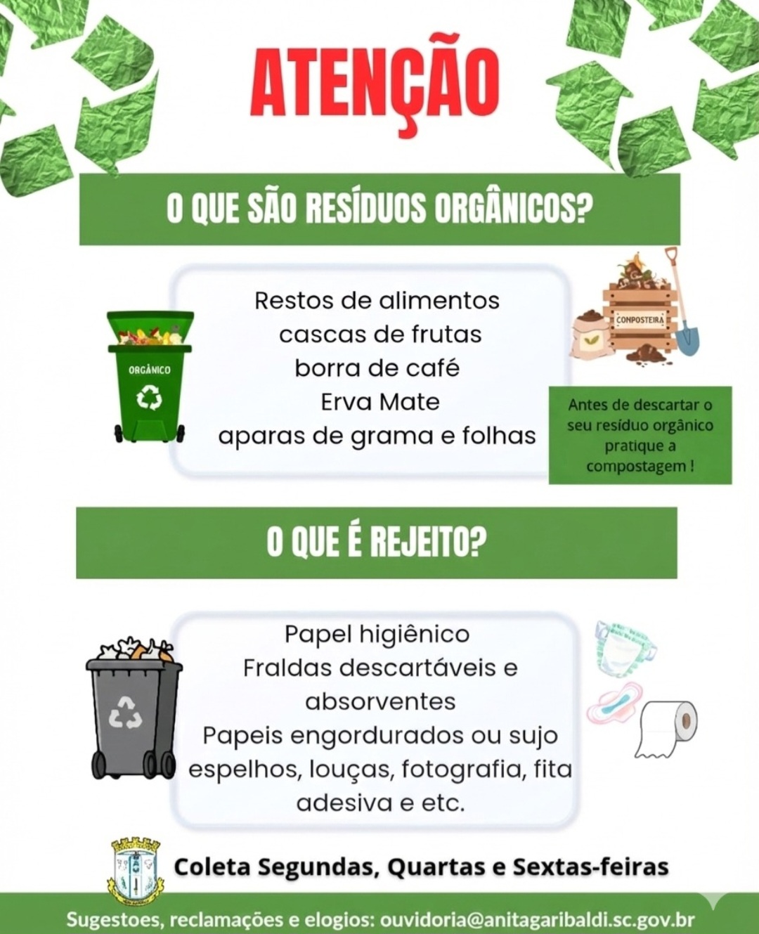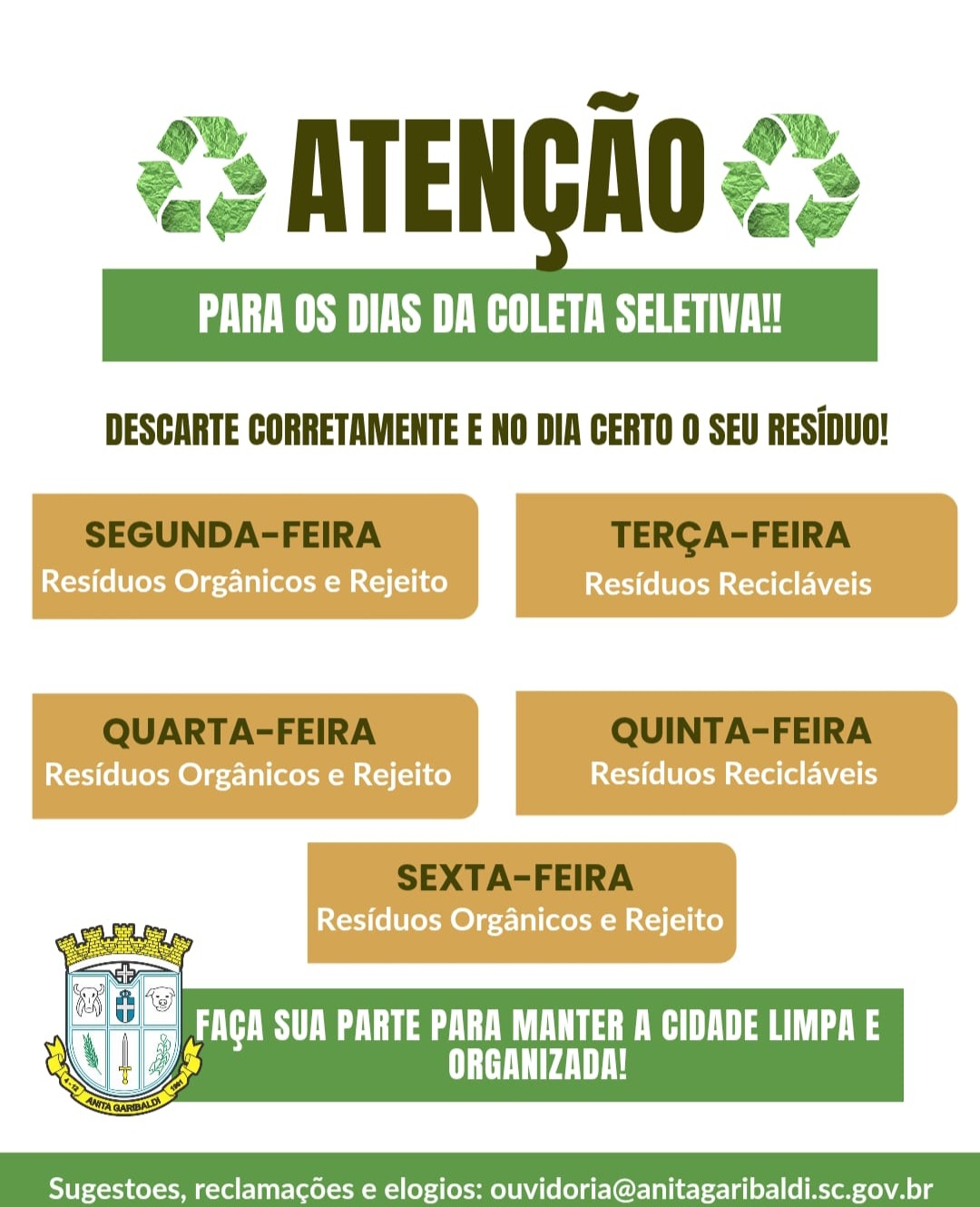 A prefeitura destaca que a colaboração da população é fundamental para o bom funcionamento do serviço e para reduzir impactos ambientais. Dúvidas, sugestões, reclamações ou elogios podem ser encaminhados à ouvidoria do município pelo e-mail ouvidoria@anitagaribaldi.sc.gov.br.