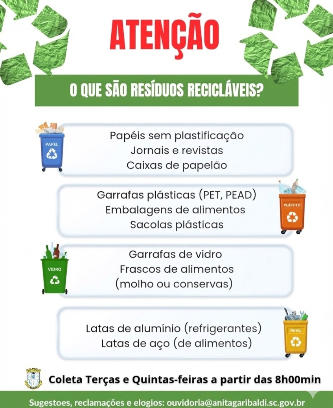 A Prefeitura de Anita Garibaldi informa sobre o início da coleta seletiva do lixo no município. As ações terão início nesta terça-feira, dia 6 de janeiro de 2026. Reforçamos o cronograma da coleta seletiva no município e orientamos a população a separar corretamente os resíduos e respeitar os dias de recolhimento. A medida busca manter a cidade limpa, organizada e contribuir com a preservação do meio ambiente.