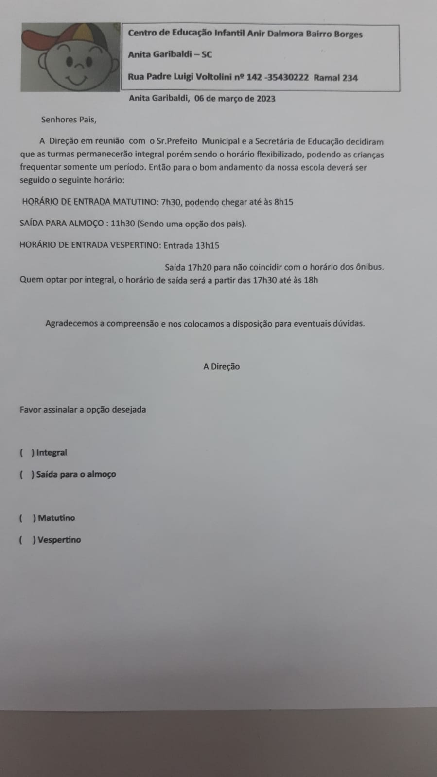 O ano letivo de 2023 apresentou novidades no município, com as atividades para crianças de 0 á 3 anos na Creche Anir Dalmora, onde em um primeiro momento as atividades seriam o dia todo, das 7e30h até as 18h (período integral).