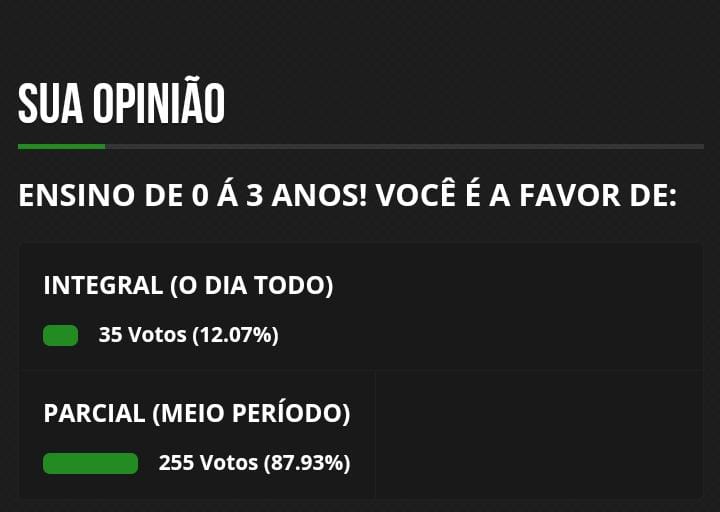 A Rádio Alegria FM lançou enquete no site e redes sociais sobre a preferências dos pais e o período escolar, onde a maioria, em quase 90% queriam o período parcial (ou seja de manhã ou a tarde, ou ainda de modo flexível para o dia todo) não concordando com a obrigatoriedade do dia todo.