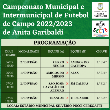 O Estádio Municipal Silvério Pucci Ceregatti sediará, neste sábado e domingo (06 e 07/05), a grande final do Campeonato Municipal e Intermunicipal de Futebol de Campo 2022/2023 de Anita Garibaldi.