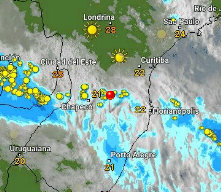 A localização de Anita Garibaldi está sinalizada pelo “marco vermelho”. Ainda segue chovendo na região, mas com intensidade fraca.
