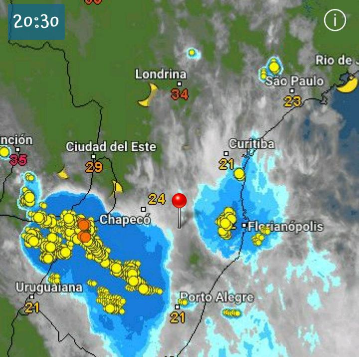 Nossa equipe acompanha em tempo real a movimentação da frente fria no Sul do Brasil. Percebemos que os pontos em amarelos (chuva torrencial) estão em regiões mais distante da nossa localização geográfica.