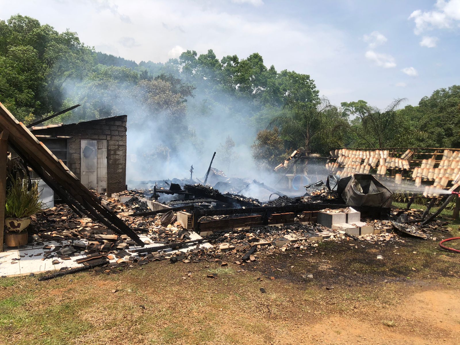 Chegando no local do incêndio, a casa já havia sido toda consumida pelas chamas, a Prefeitura utilizando caminhão pipa já havia dado o combate inicial e extinguido praticamente todos os focos do incêndio.